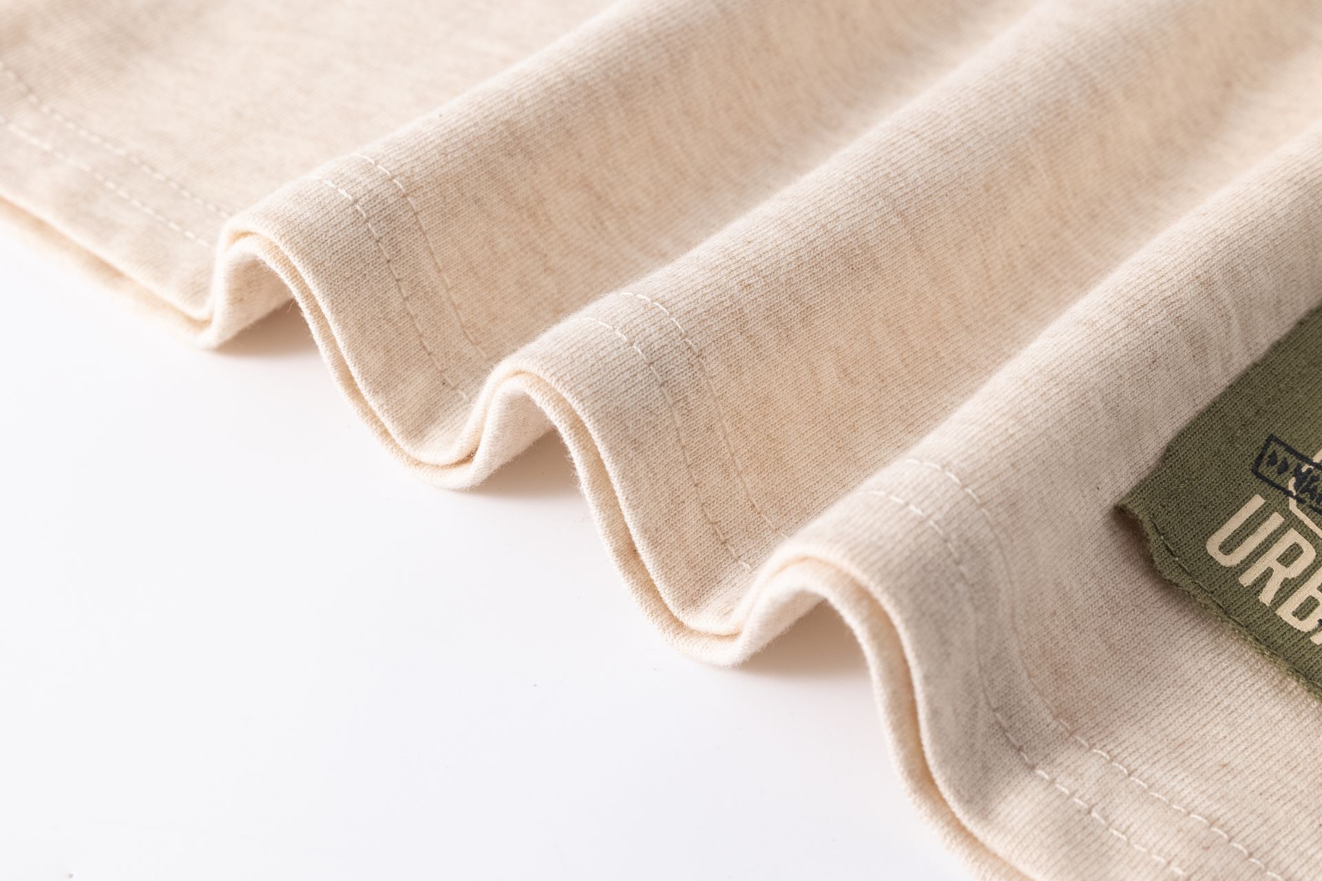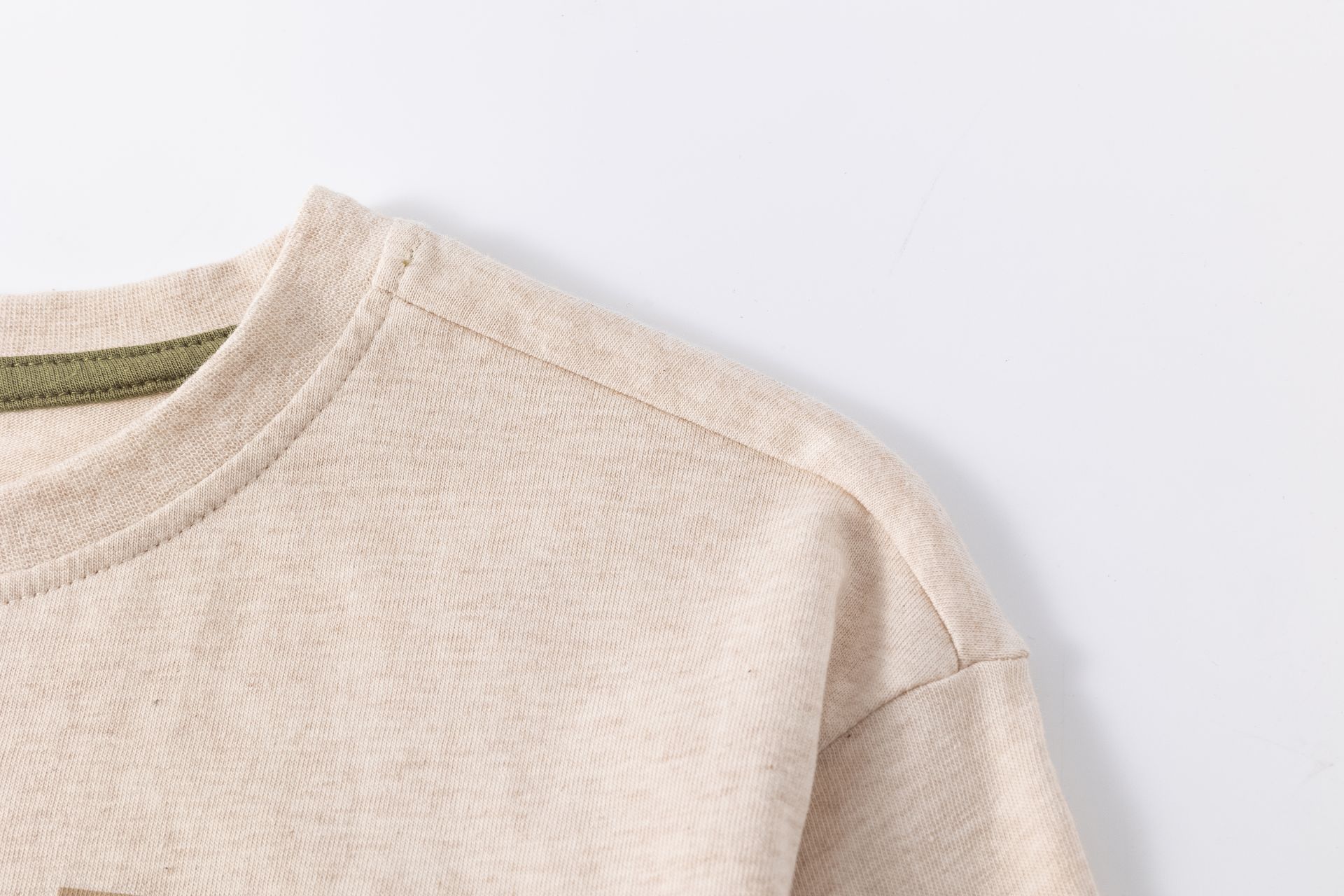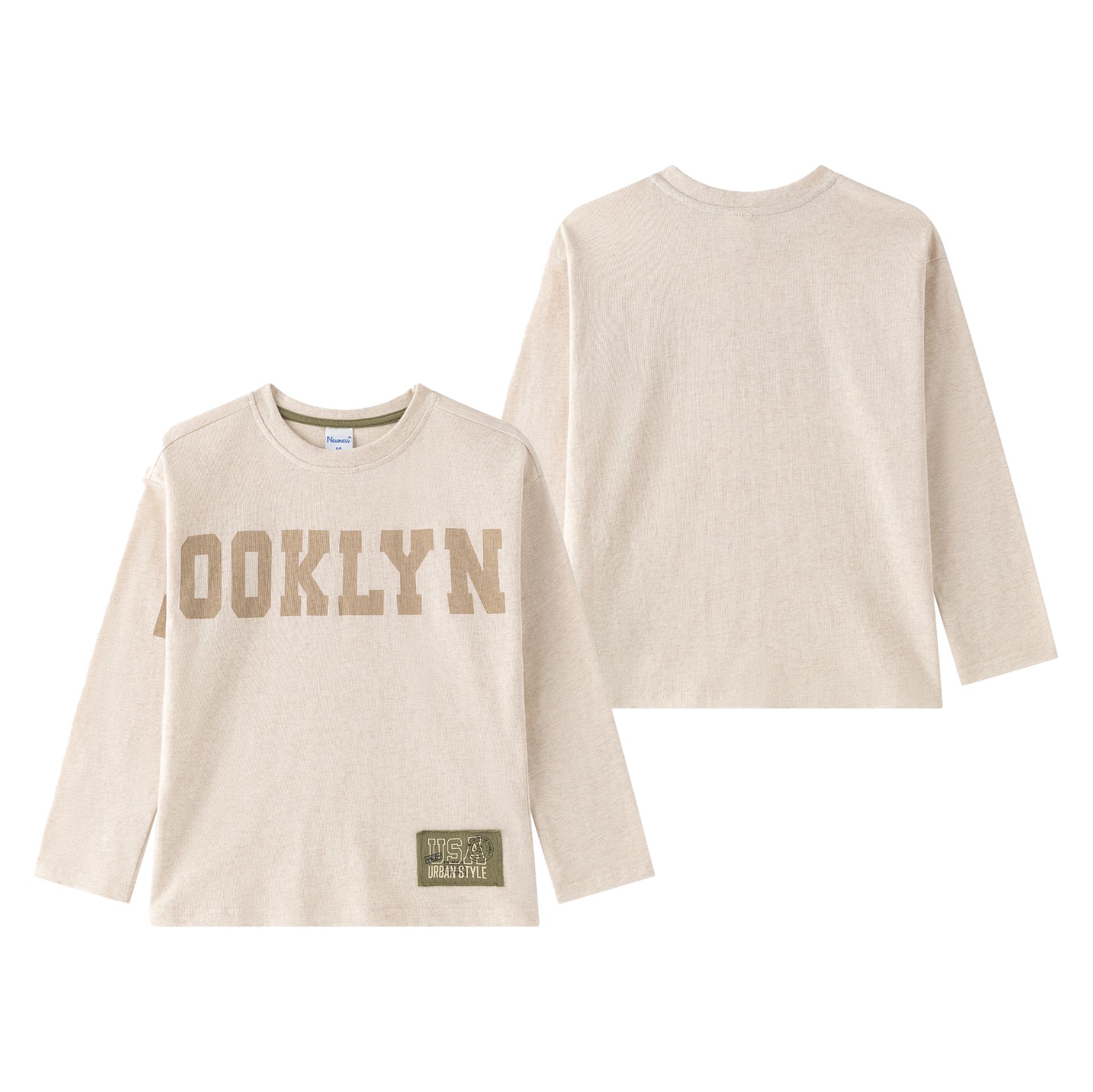 Camiseta manga larga de niño. Gráfico de frase d8 e printing, con etiqueta en la parte inferior. Color beige.