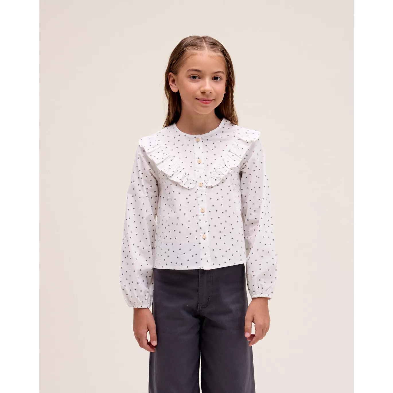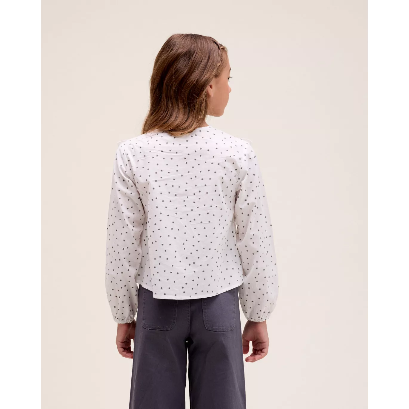 Blusa de niña de manga larga blanca con estampado de estrellas gris, volante delantero en V, lazo y puños elásticos, elegante y cómoda.