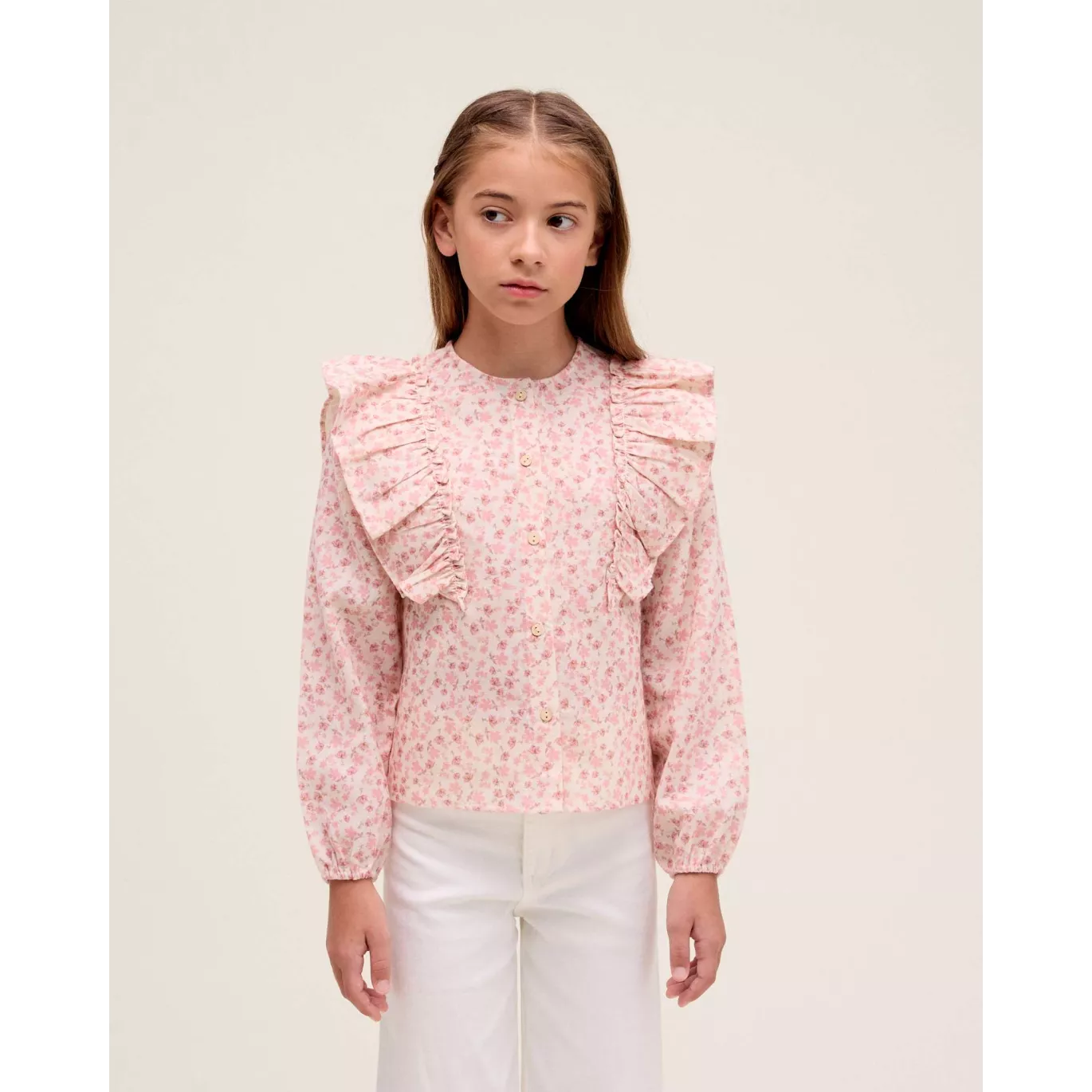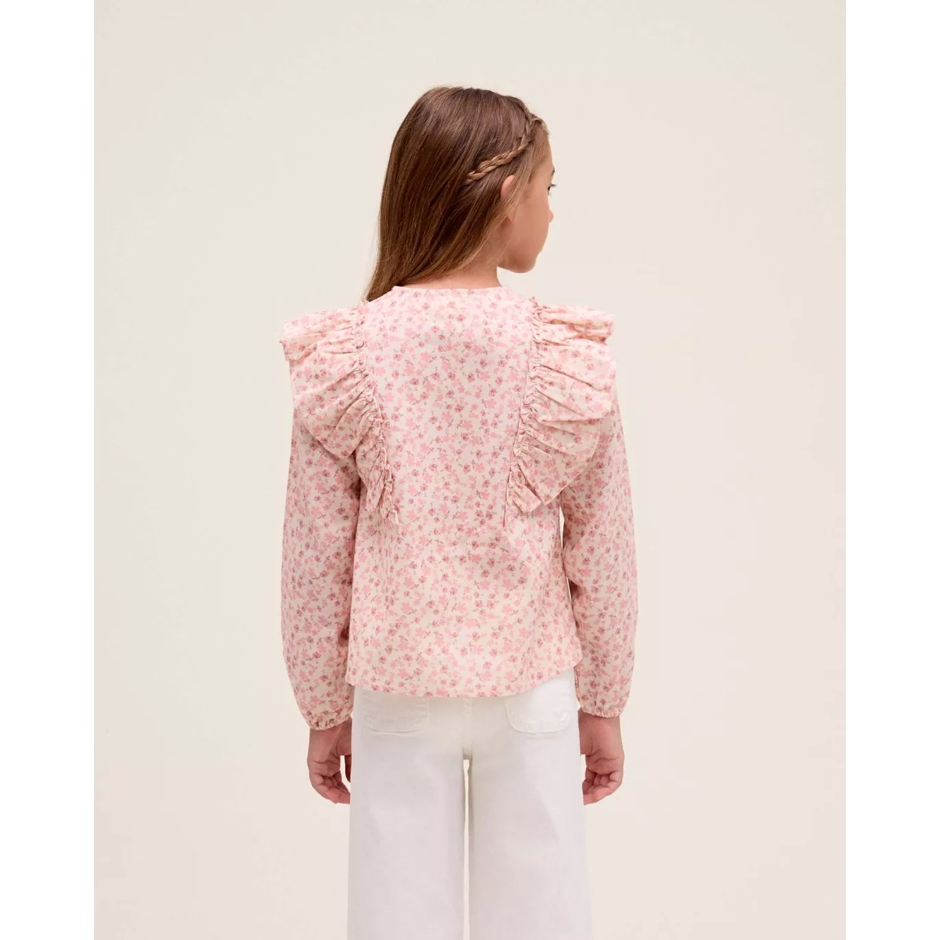 Blusa de niña de flores rosas con volantes laterales en la parte delantera y espalda, cuello mao, puños elásticos y cierre delantero con botones.