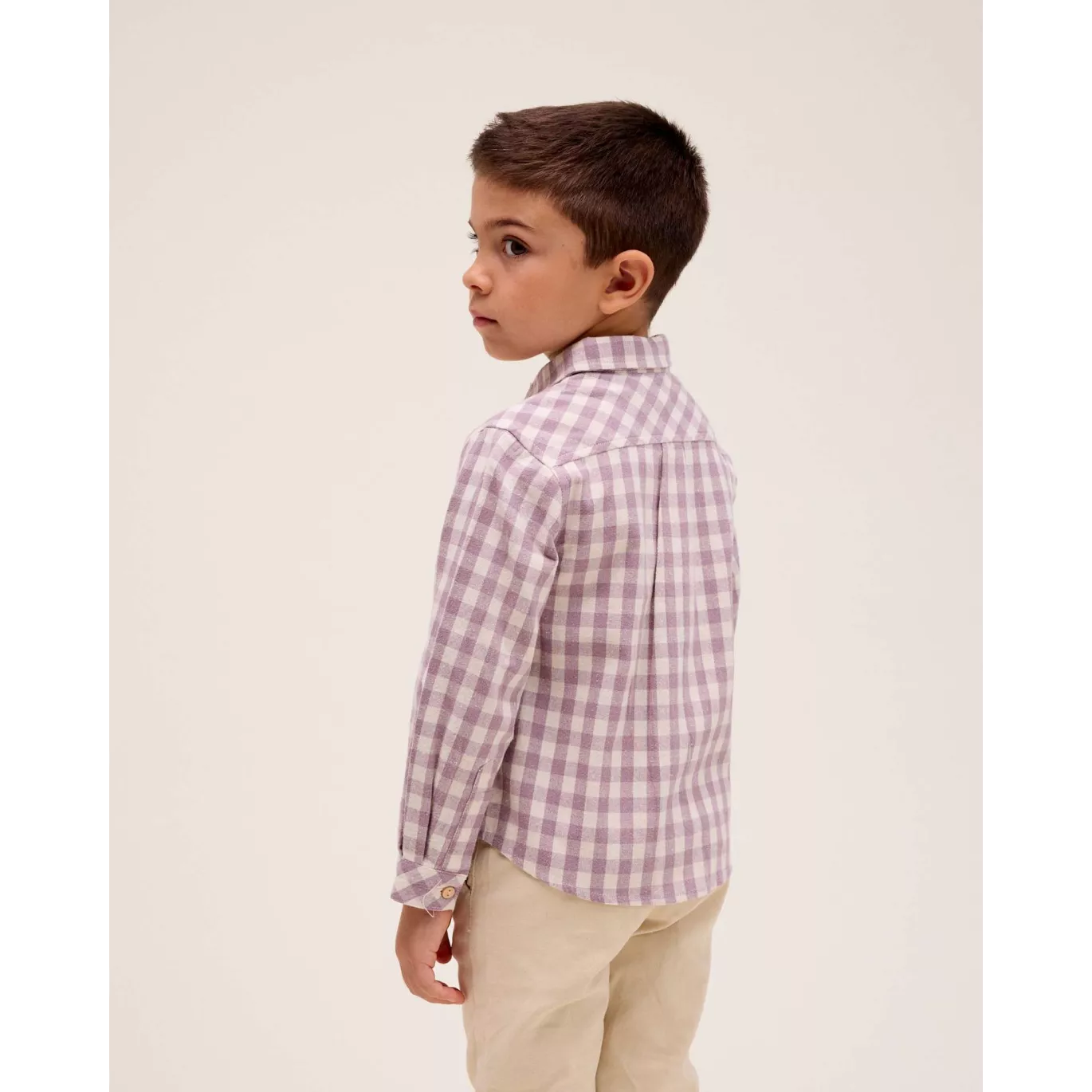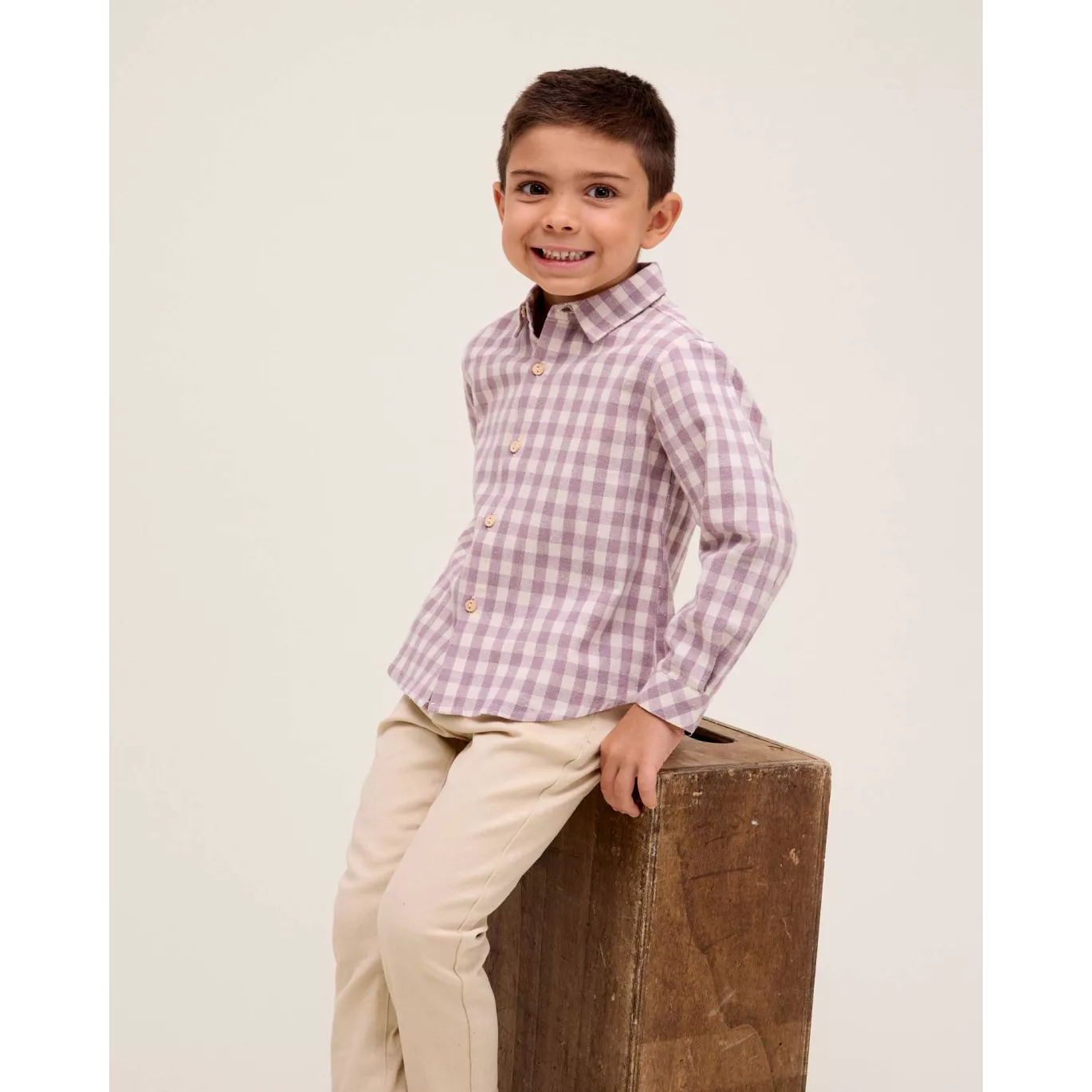 Camisa de niño de manga larga de cuadros color malva y beige, cuello pico y cierre delantero con botones de madera, práctica y con estilo.