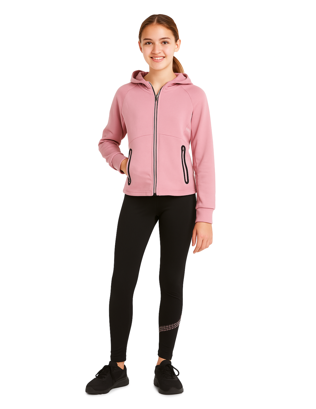 Chándal niña dos piezas, sudadera con bolsillos delanteros y capucha. Pantalón tipo leging.