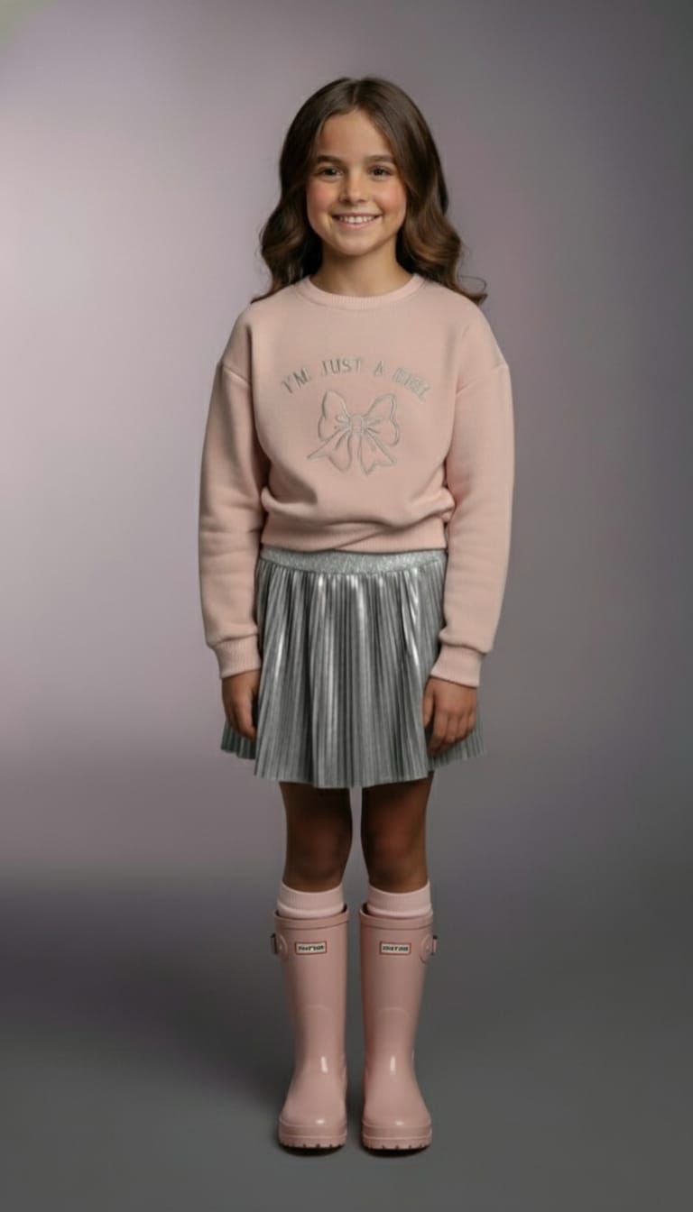 Conjunto sudadera de felpa y falda plisada en plata brillo.