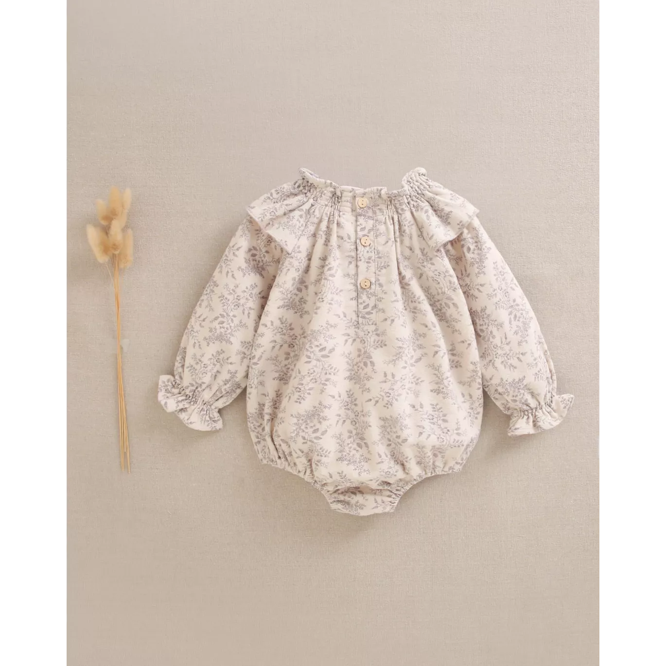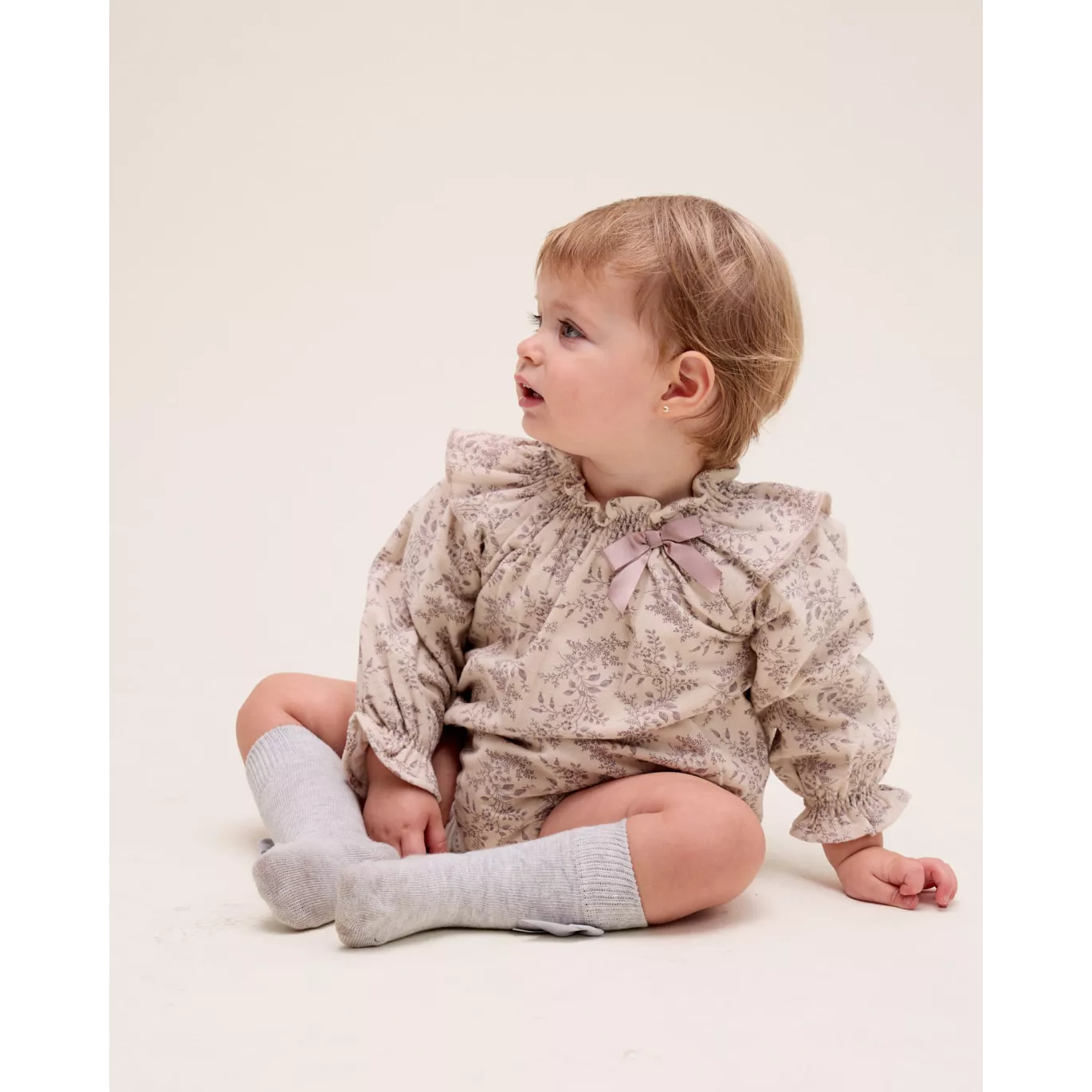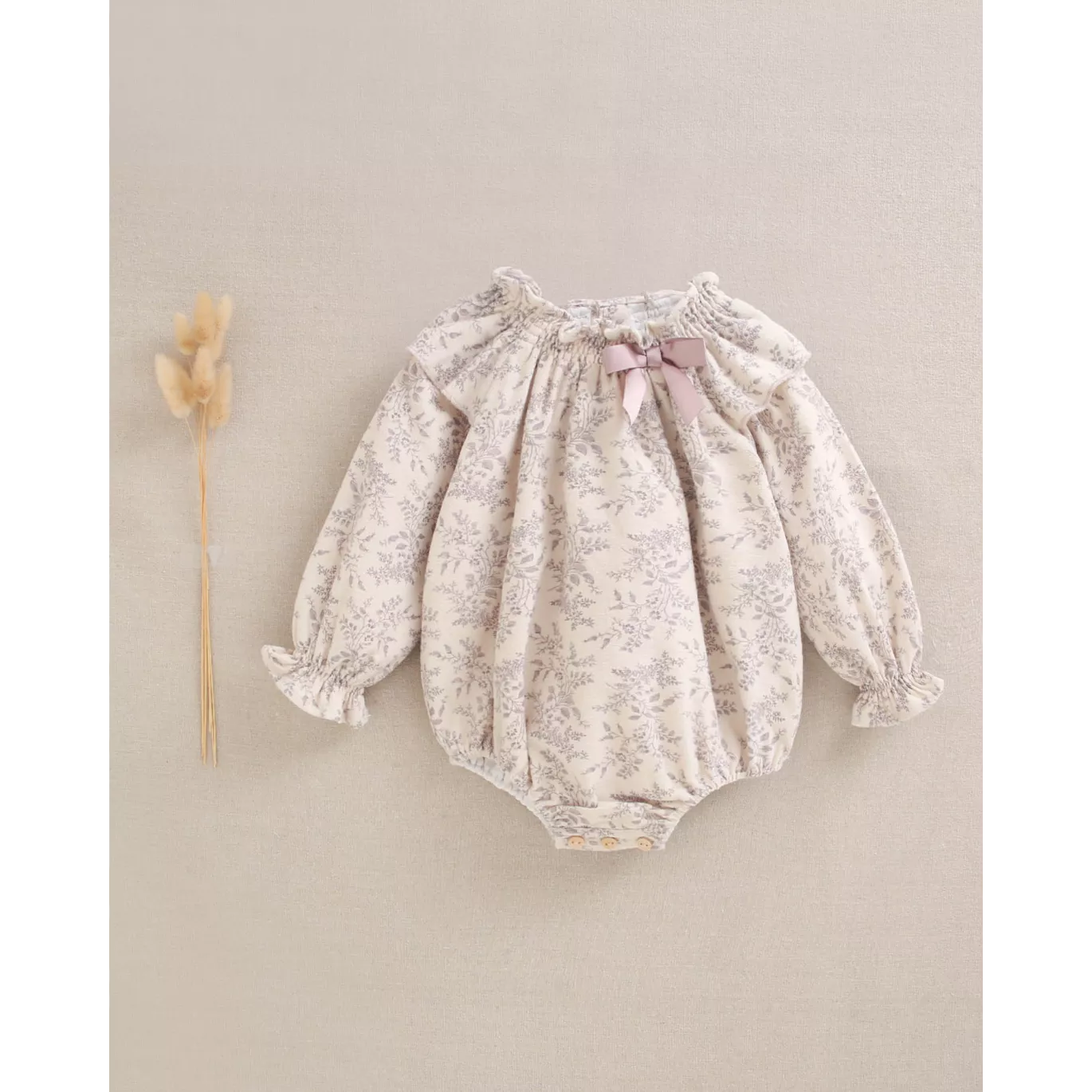 Ranita de bebé niña con estampado de hojas malva y detalle de lazo satinado en el cuello. Manga larga con puño elástico. Cierre en la espalda con botones.