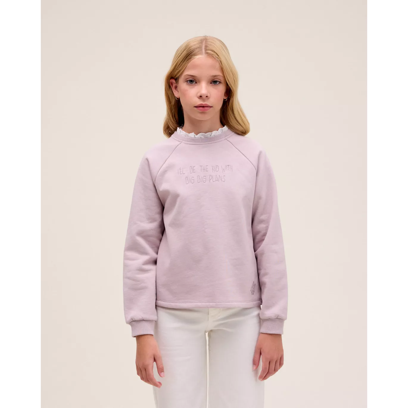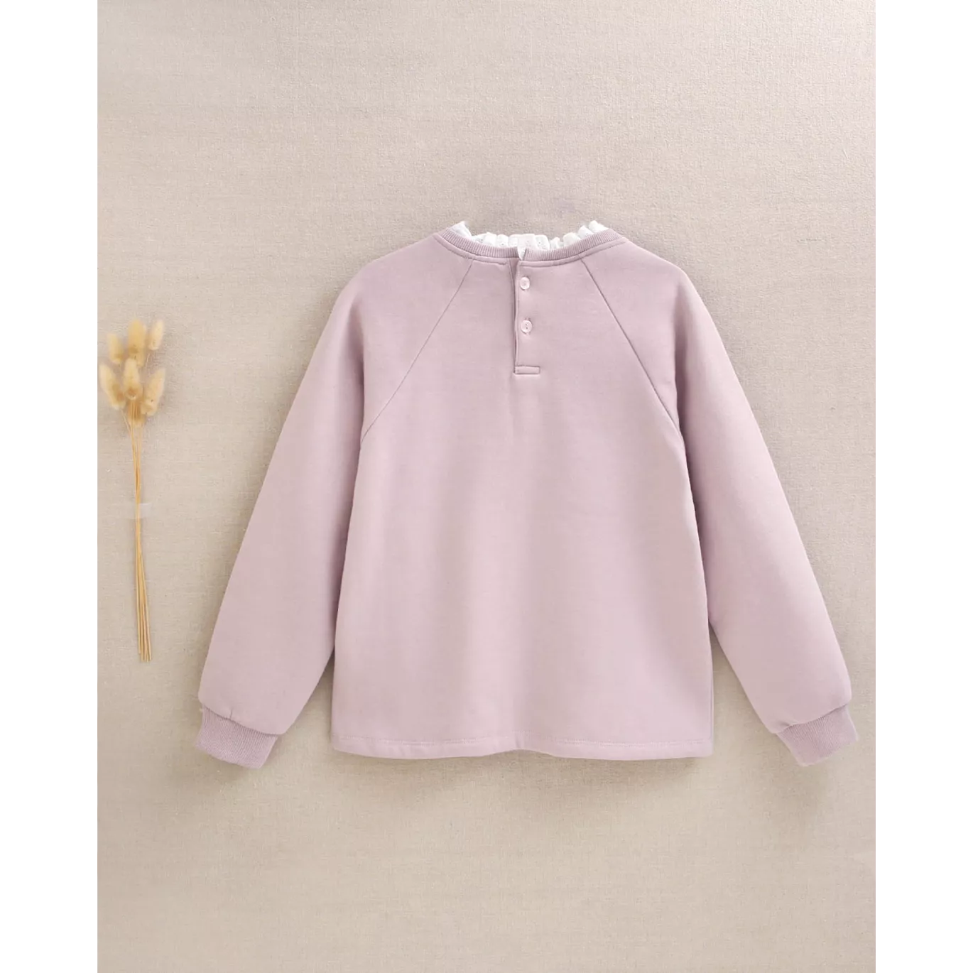 Sudadera de niña malva con cuello camisa fruncido, manga larga con puño elástico, frase bordada en la parte delantera, cómoda y con estilo adorable.