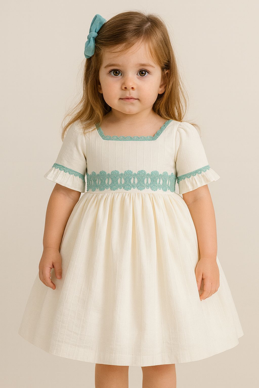 + Gastos de envioVestido color blanco con diseño sencillo y elegante. Tiene escote cuadrado adornado con cinta en color verde. Manga corta con terminación en un pequeño volante adornado con cinta en la misma tonalidad de verde. La parte de la falda es amplia y fluida lo que le da un aspecto clásico y encantador. Vestido para ocasiones especiales o ceremonia.