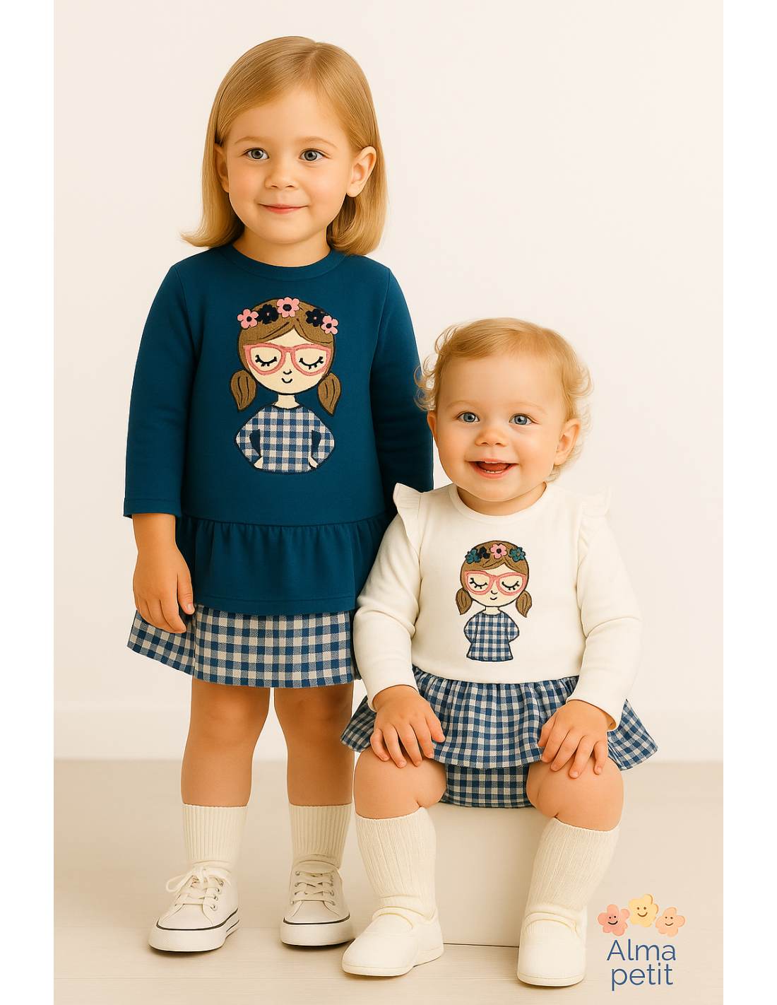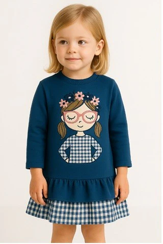 VESTIDO EN FELPA CON PELITO GRUESO, BORDADO MUÑECA, CON DOS VOLANTES UNO DE FELPA Y OTRO DE CUADRITOS VICHI.