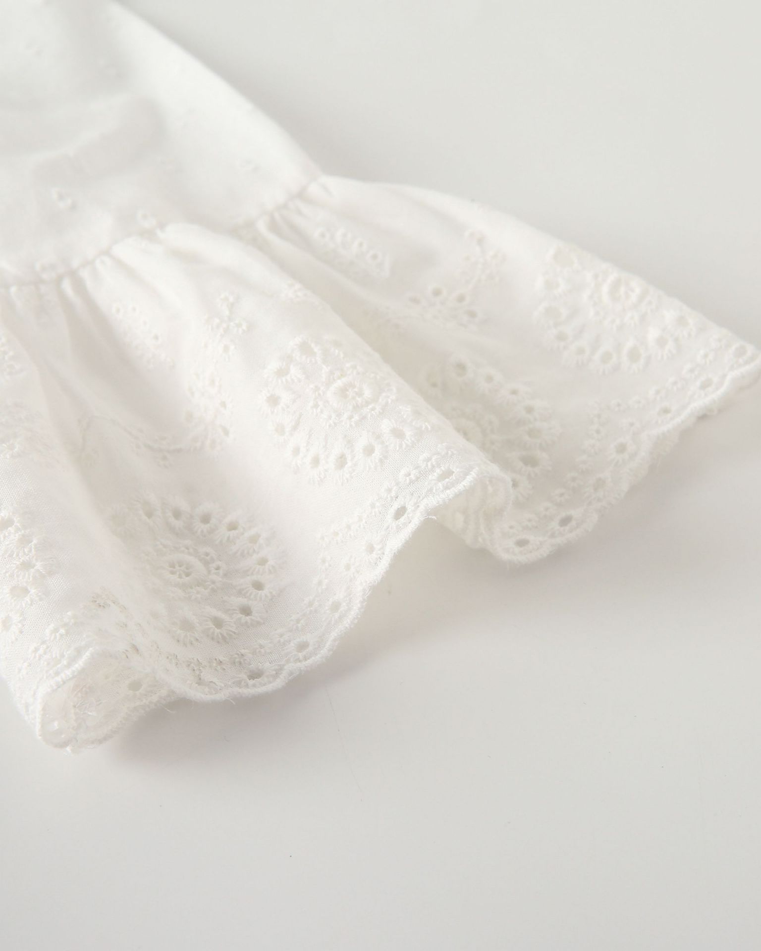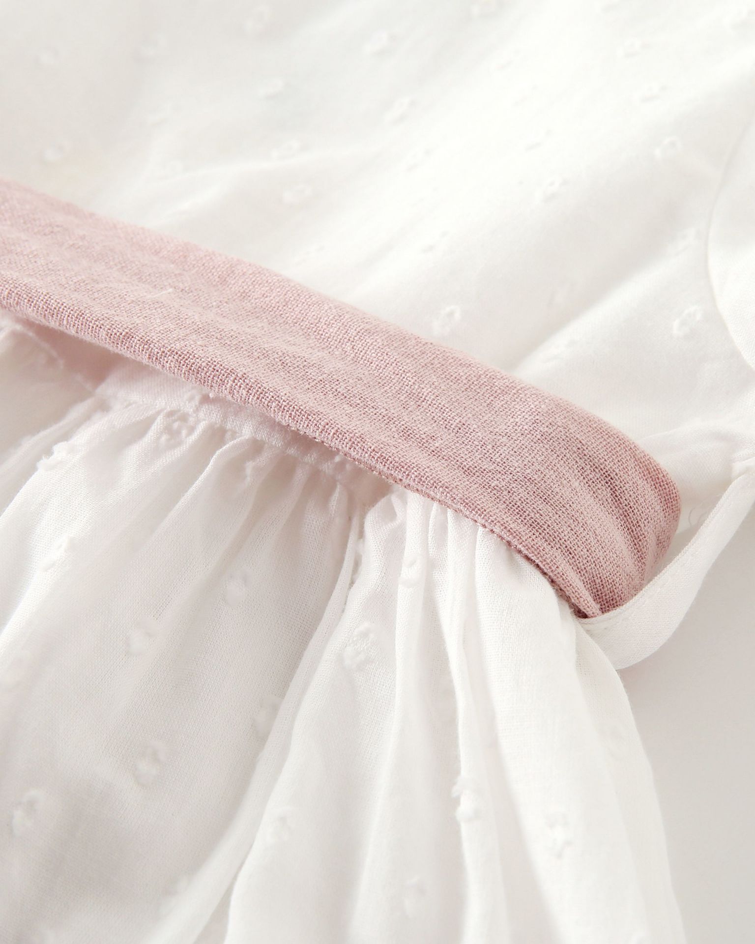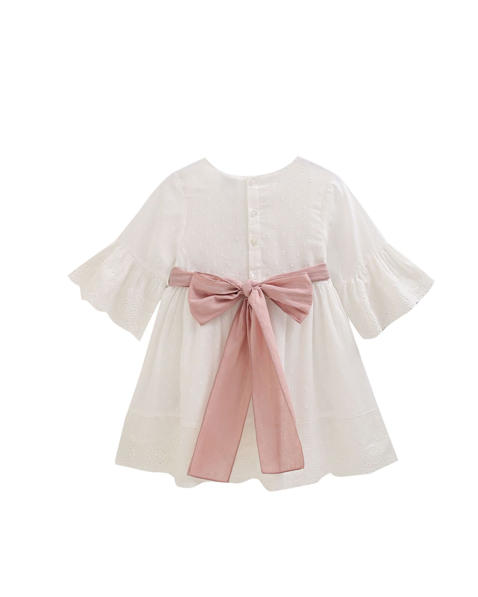 + Gastos de envioVestido de vestir para niña en blanco roto, manga francesa y tejido de plumeti. Lazo en rosa empolvado para lazada en la espalda