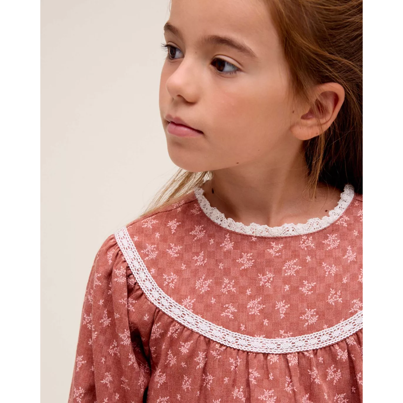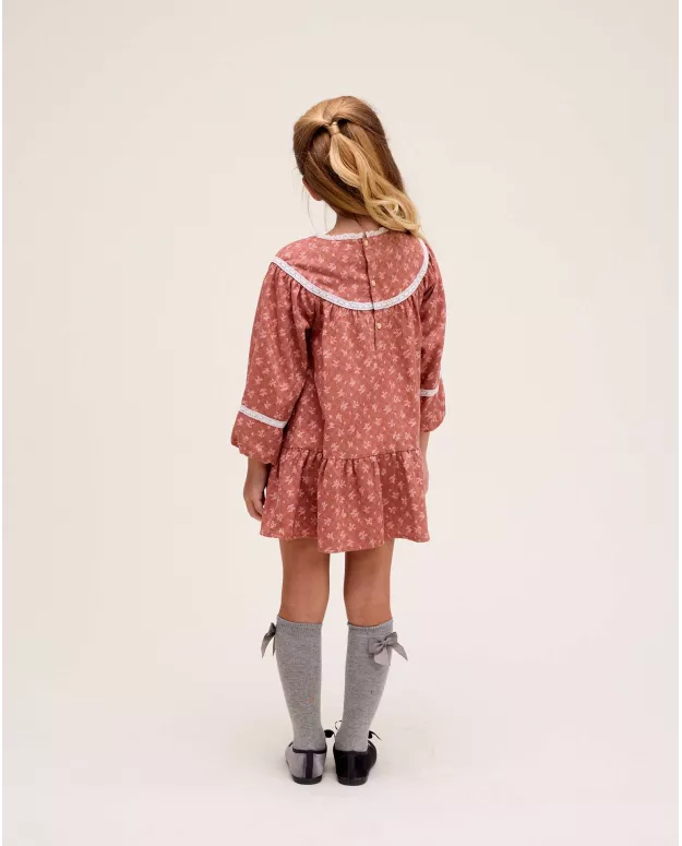 Vestido de niña corte evasé color teja con estampado de hojas blancas y ribetes en blanco en la parte delantera, cuello con fruncido y manga larga.