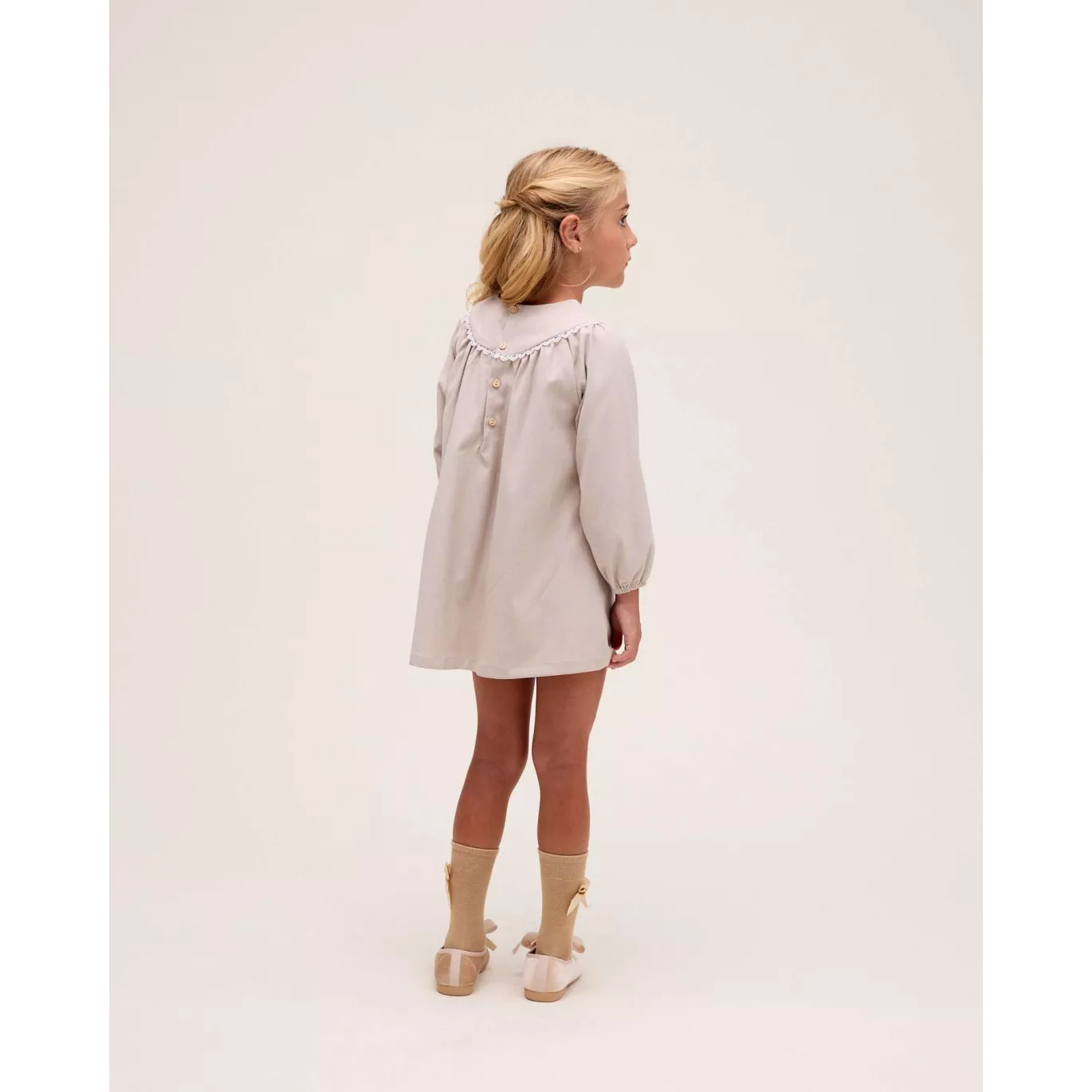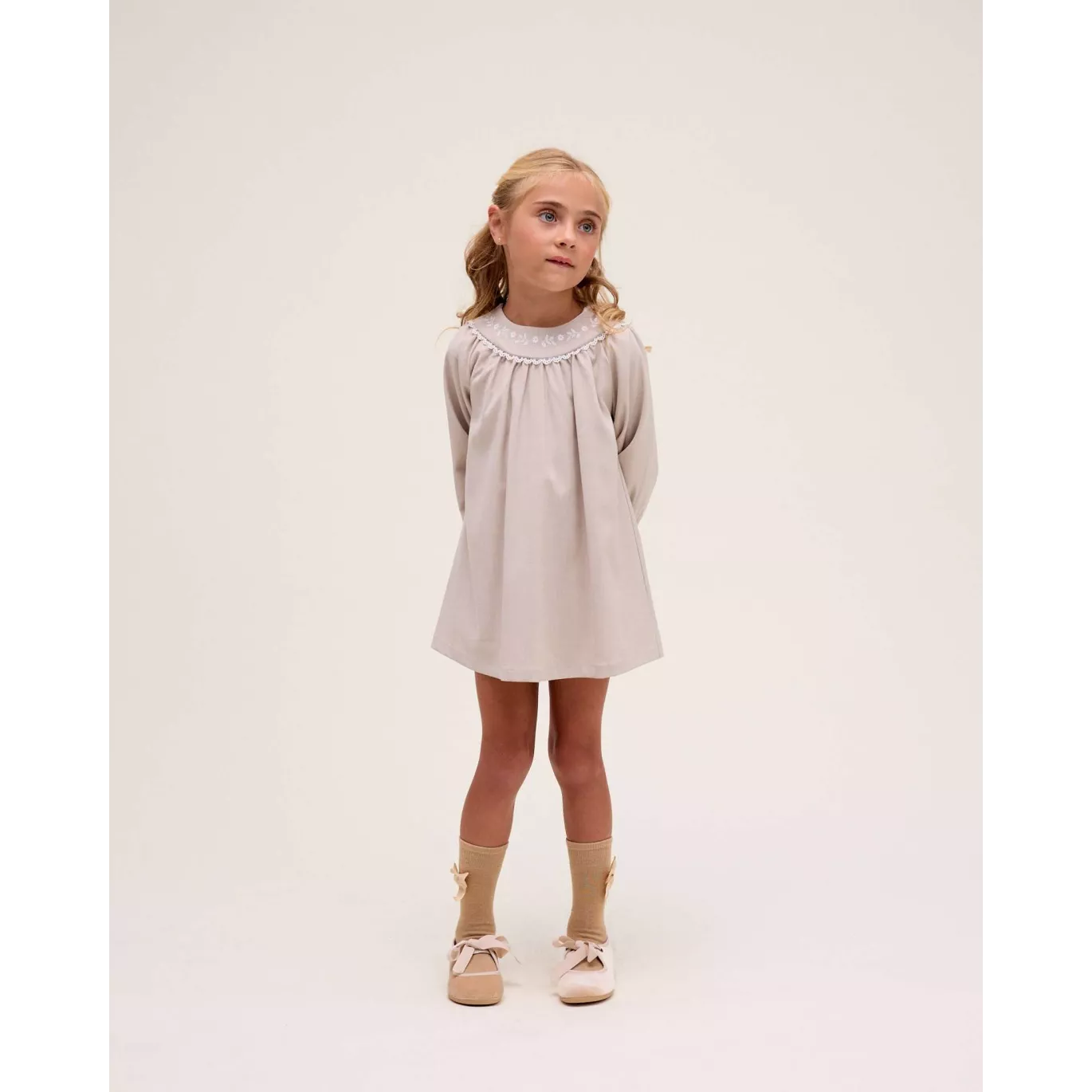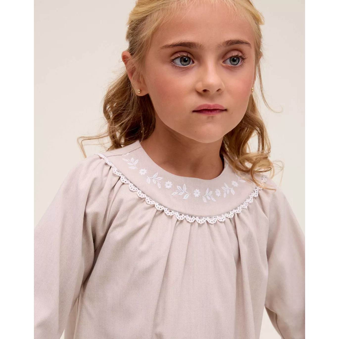 Vestido de niña de ceremonia de corte evasé beige con bordado de flores y puntilla en la parte delantera, manga larga y cierre con botones.