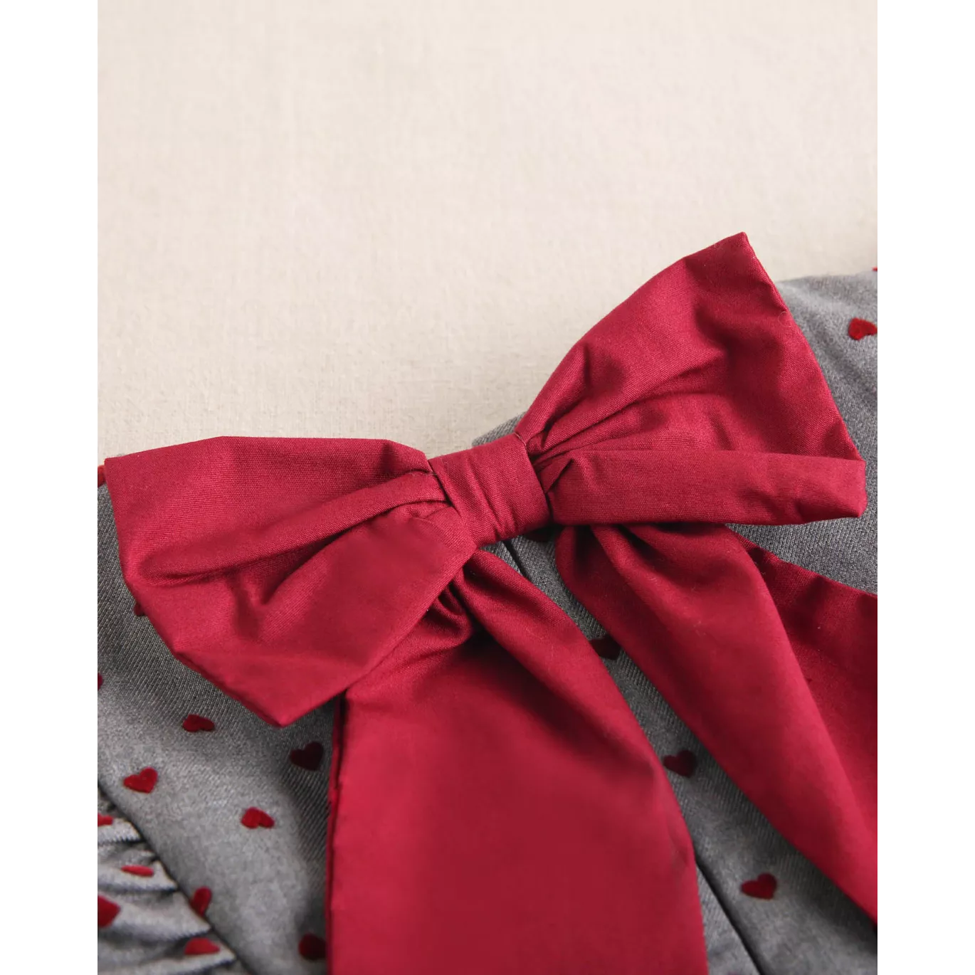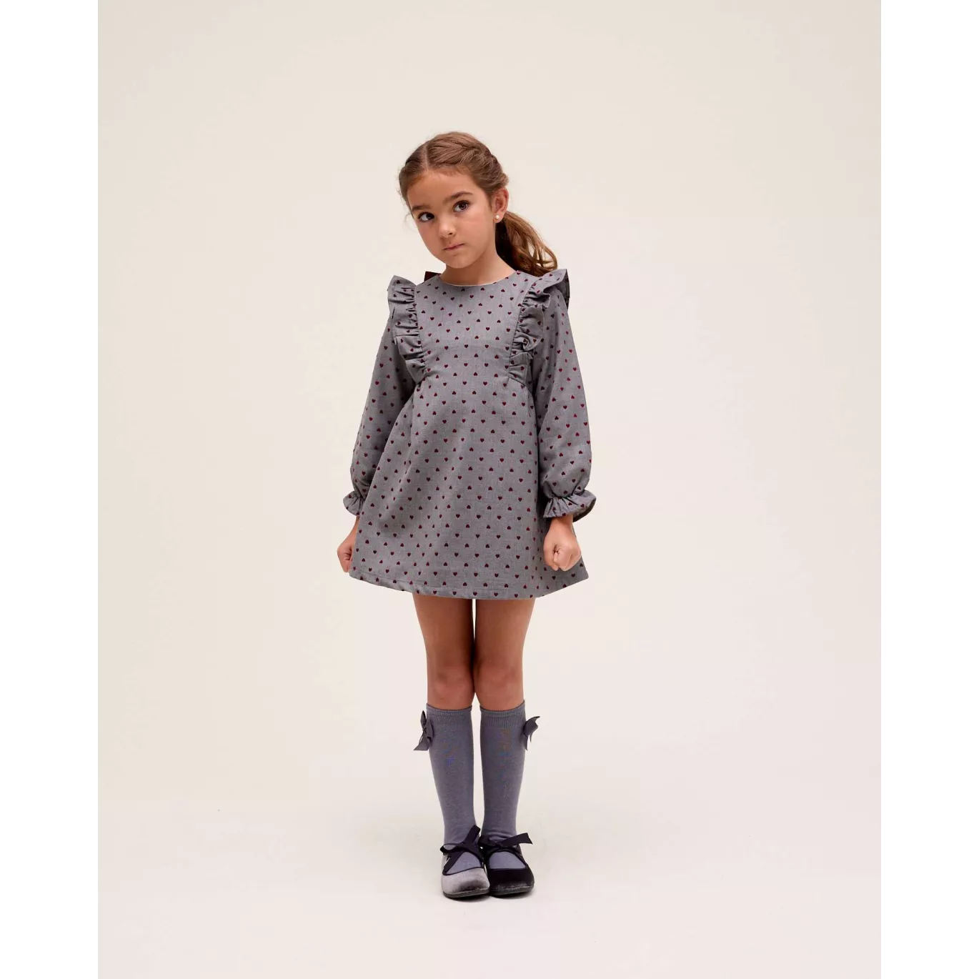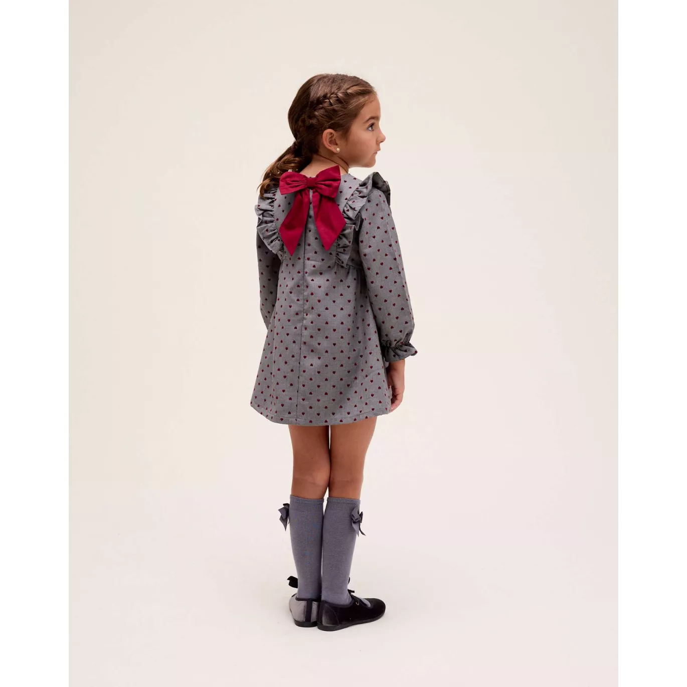 Vestido de niña evasé gris con corazones granates de terciopelo, manga larga, puño elástico, volantes laterales y lazo granate en espalda y cierre trasero.