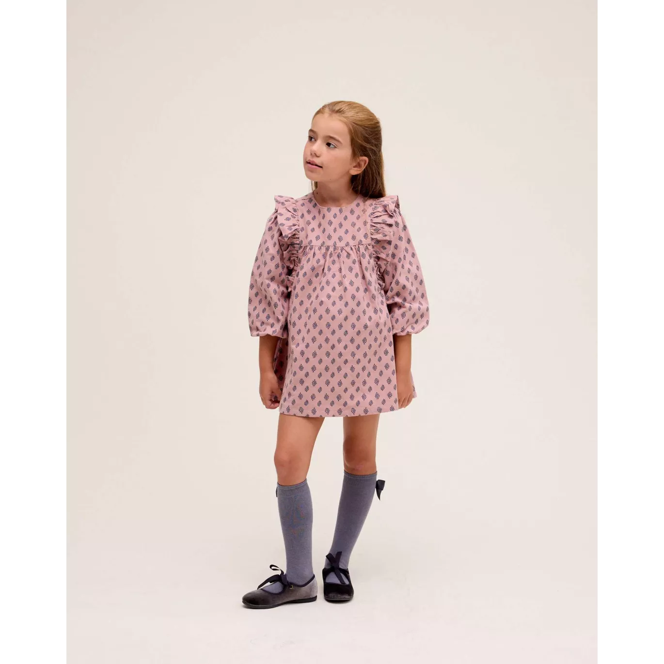 Vestido de niña corte evasé color rosa con estampado de hojas en azules, manga larga, volantes laterales en la parte delantera y espalda y cierre con botones.