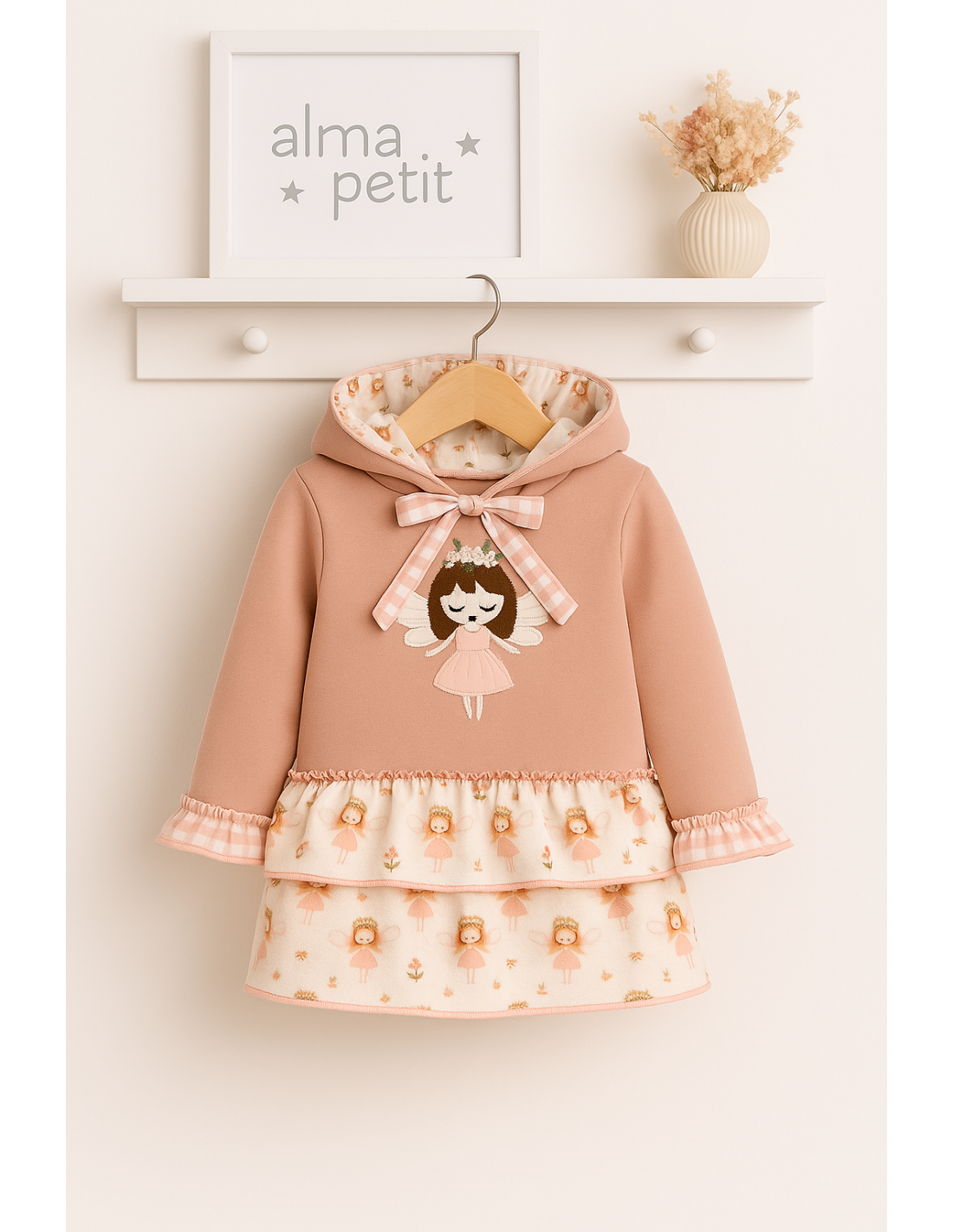 + Gastos de envioVestido estilo sudadera con pelito por dentro, capucha forrada en estampado de hadas, volante, lazo y volante puños en gasa en cuadros vichi, y los dos volantes son de gasa con estampado de hadas. Un vestido muy cuqui ideal tanto para vestir como sport.